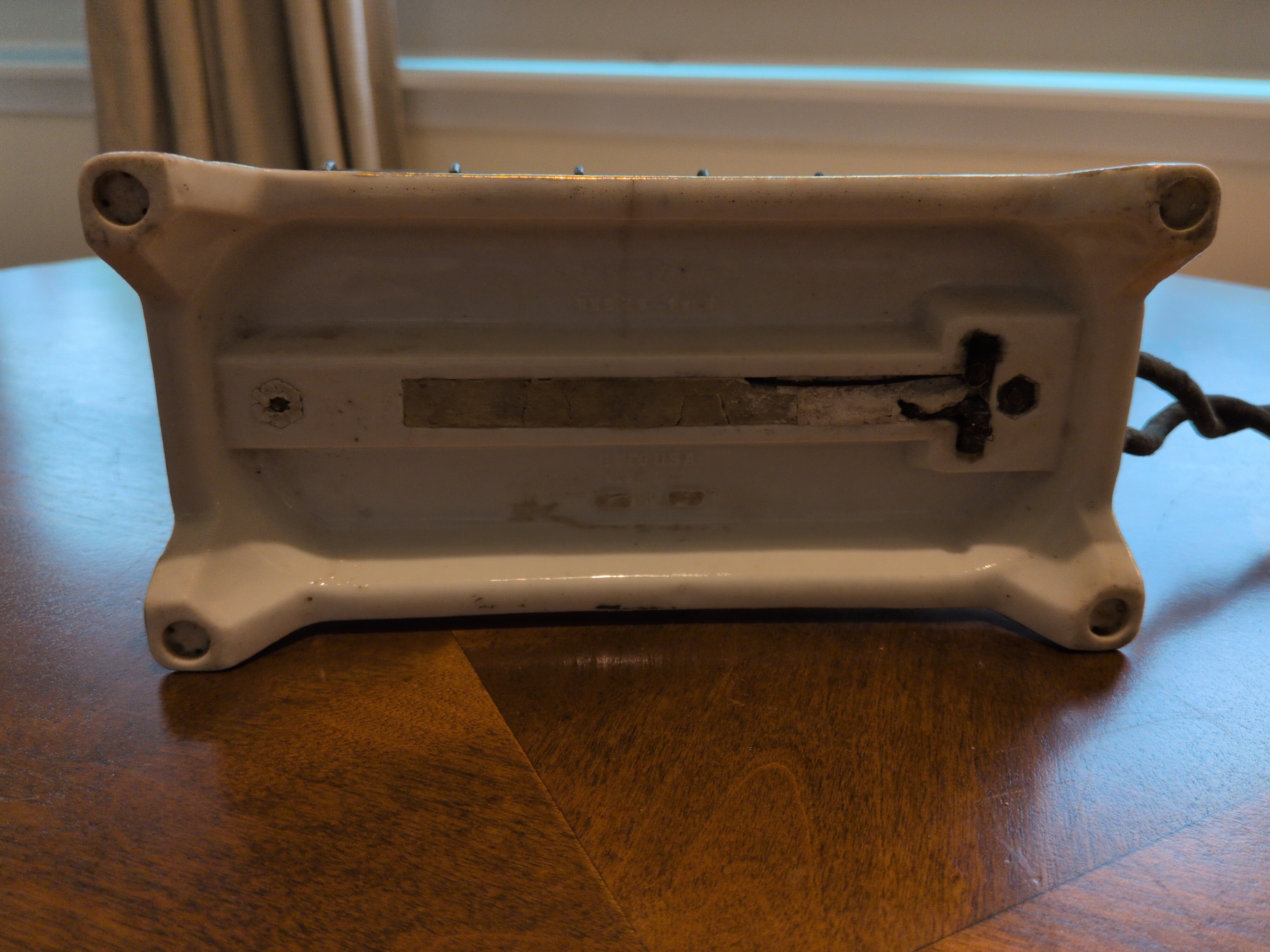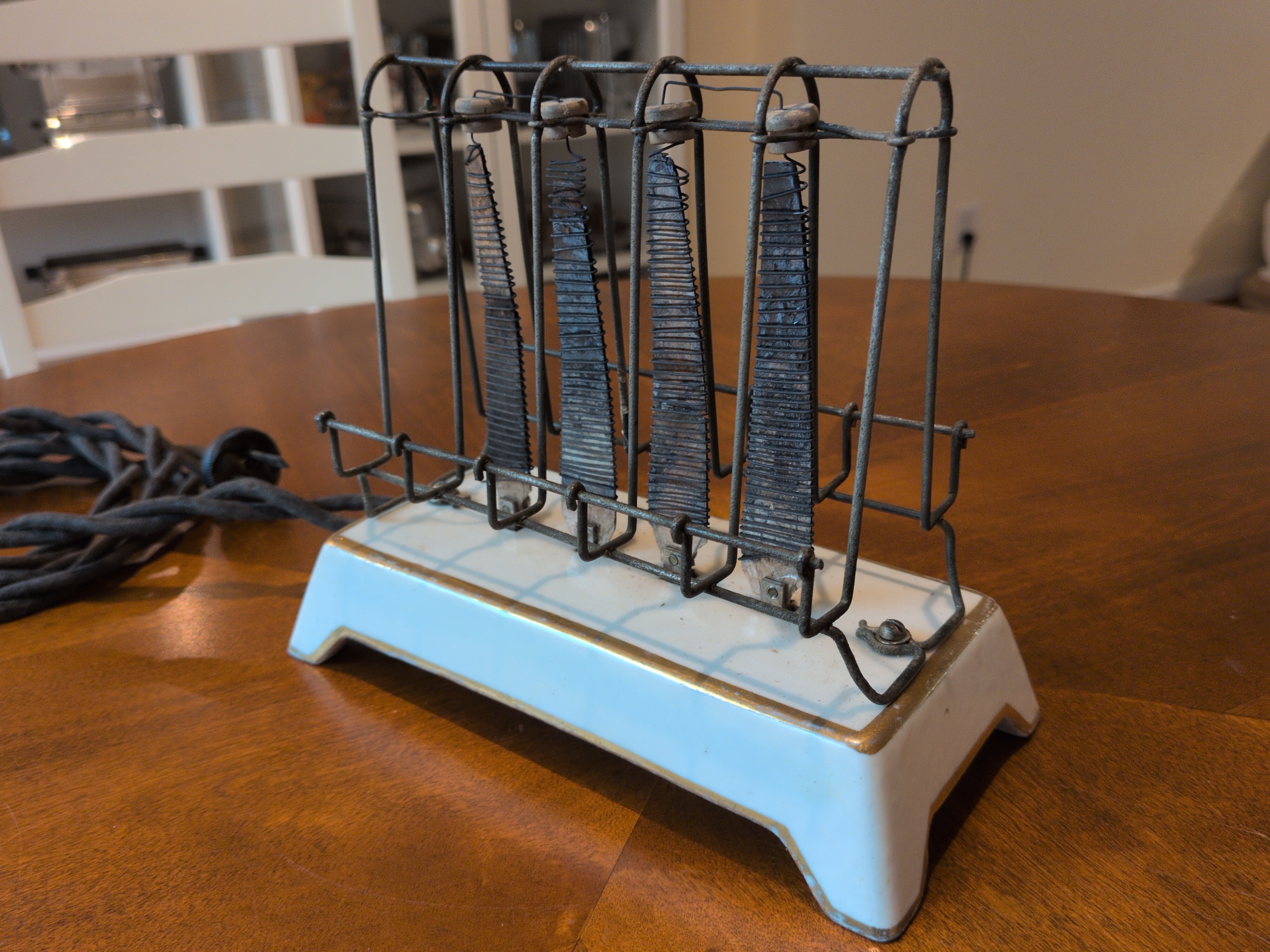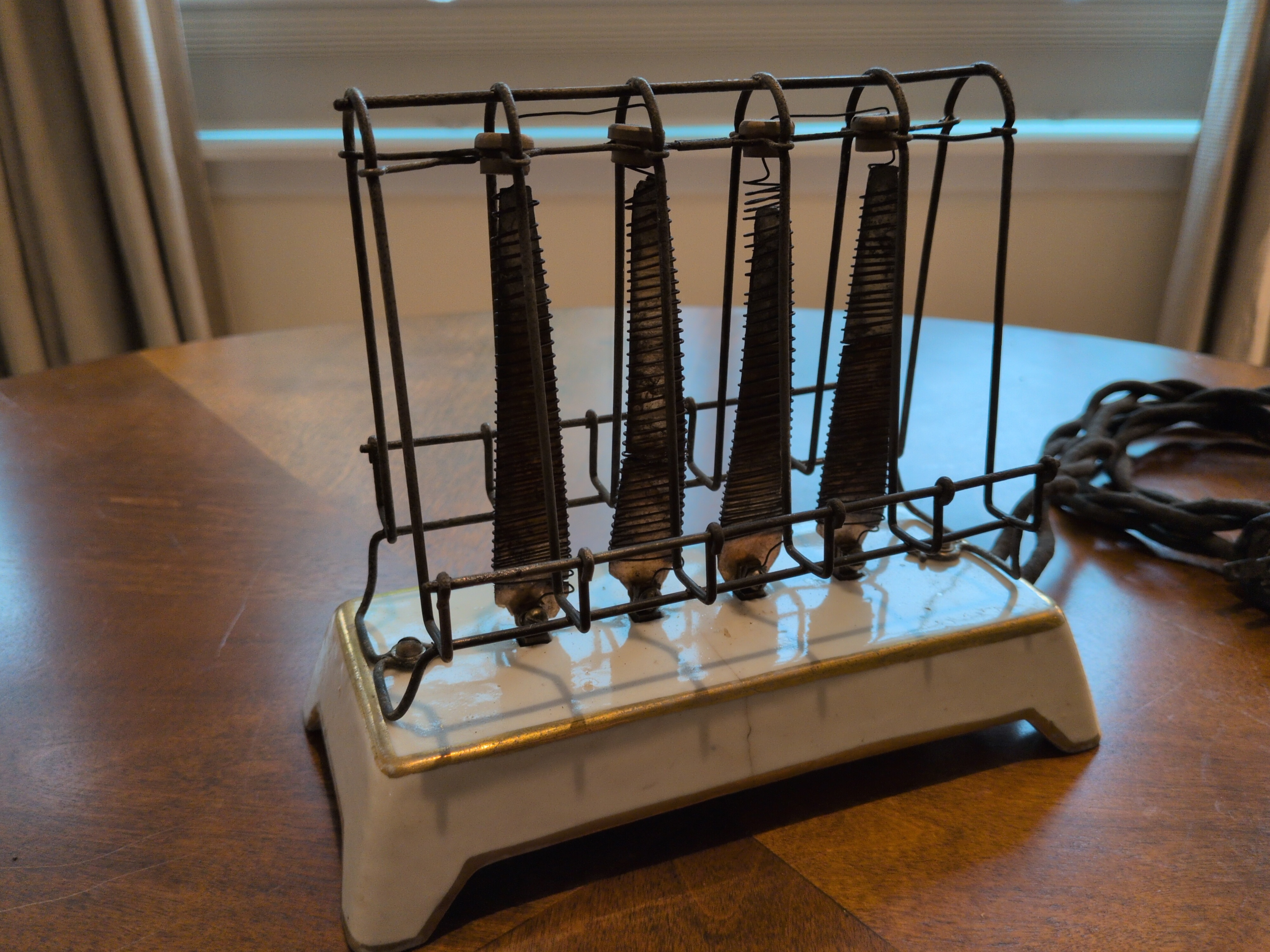 This was the first consumer available electric toaster. Many of the original were equippde with a cord bearing an edison (light bulb) socket style plug. As such, the story of the electric toaster in the early days reflects an America experiencing rapid electrification. Electricity in the home was initially only perceived as a means of replacing the lamp.