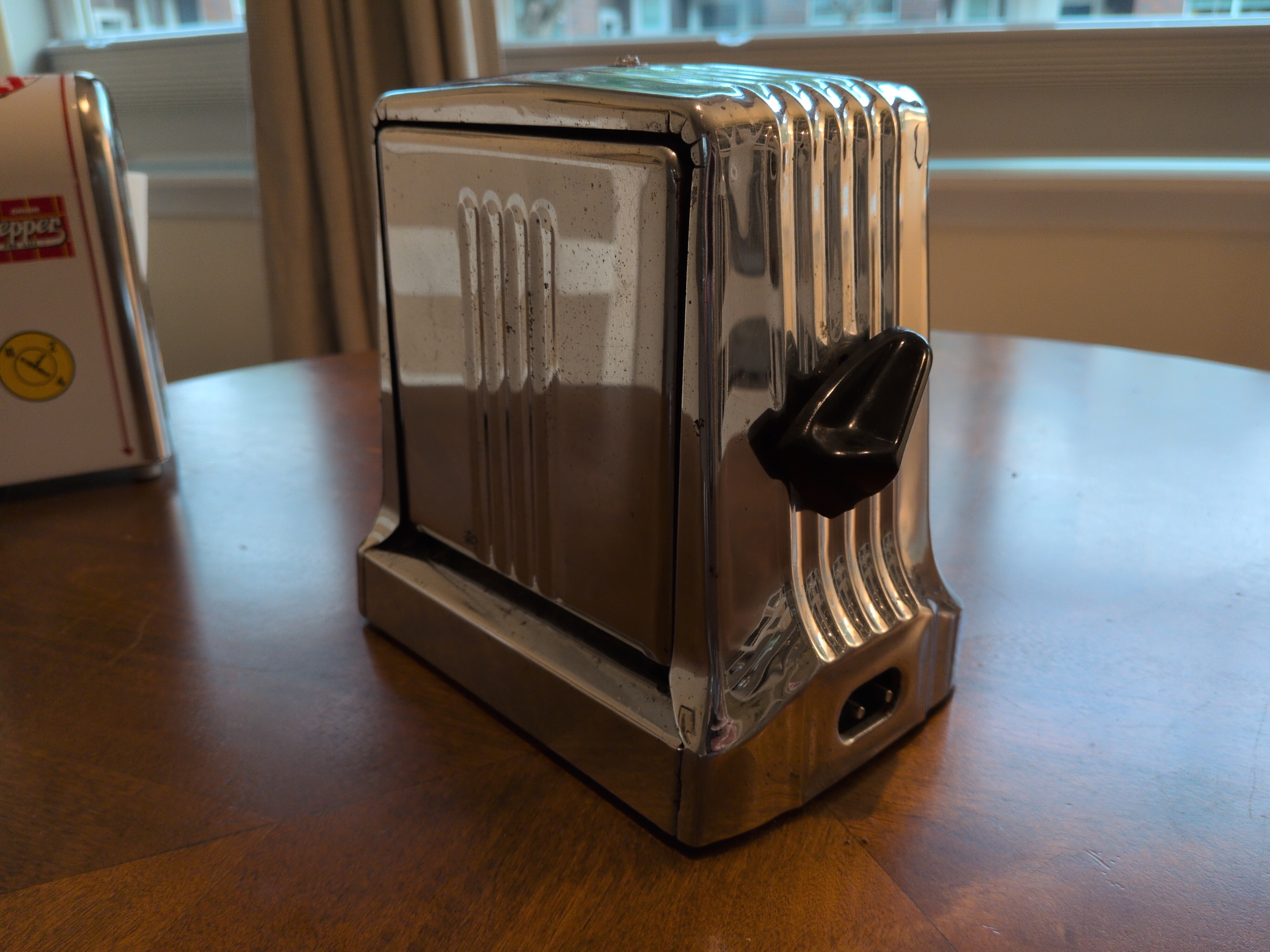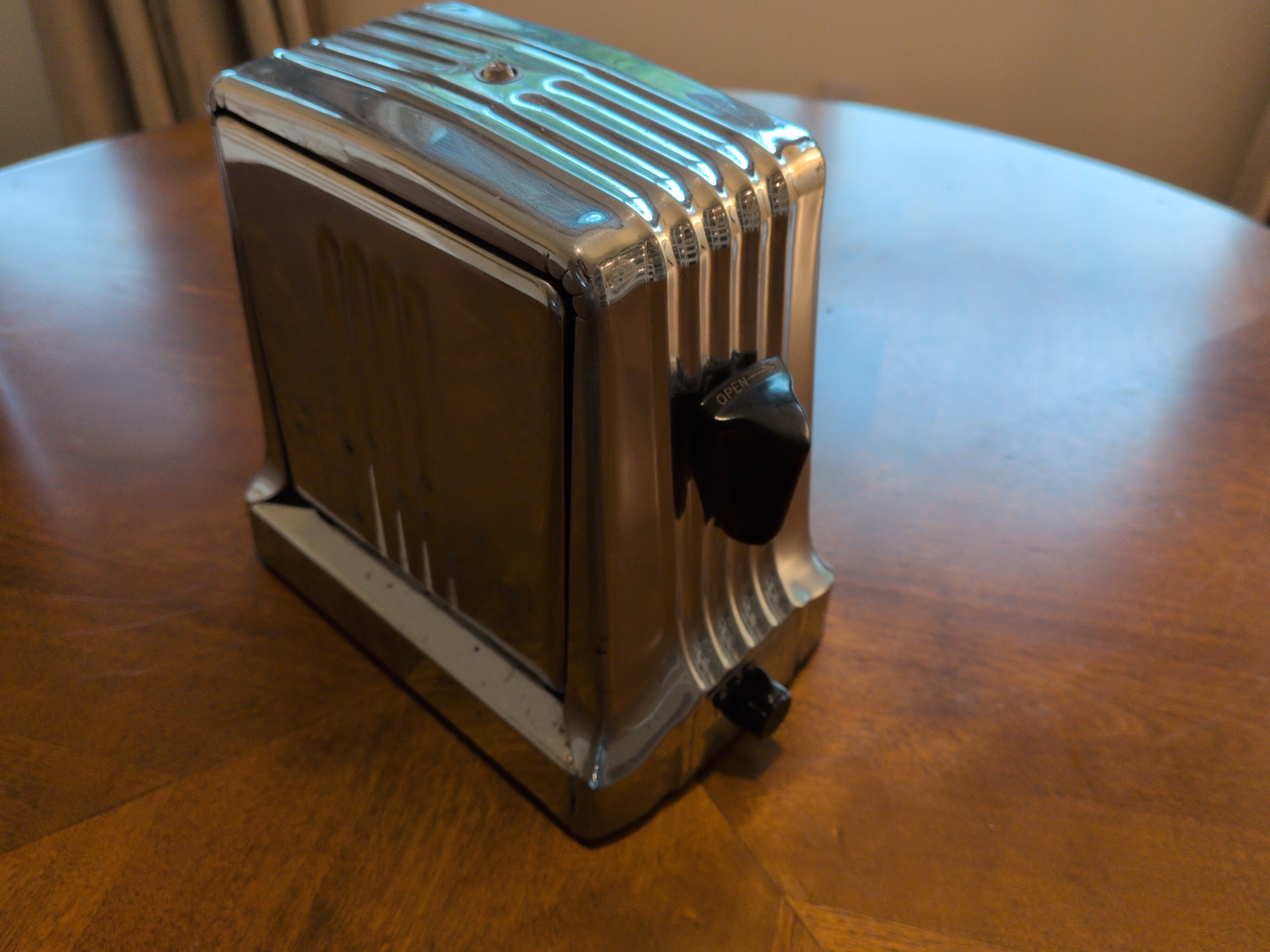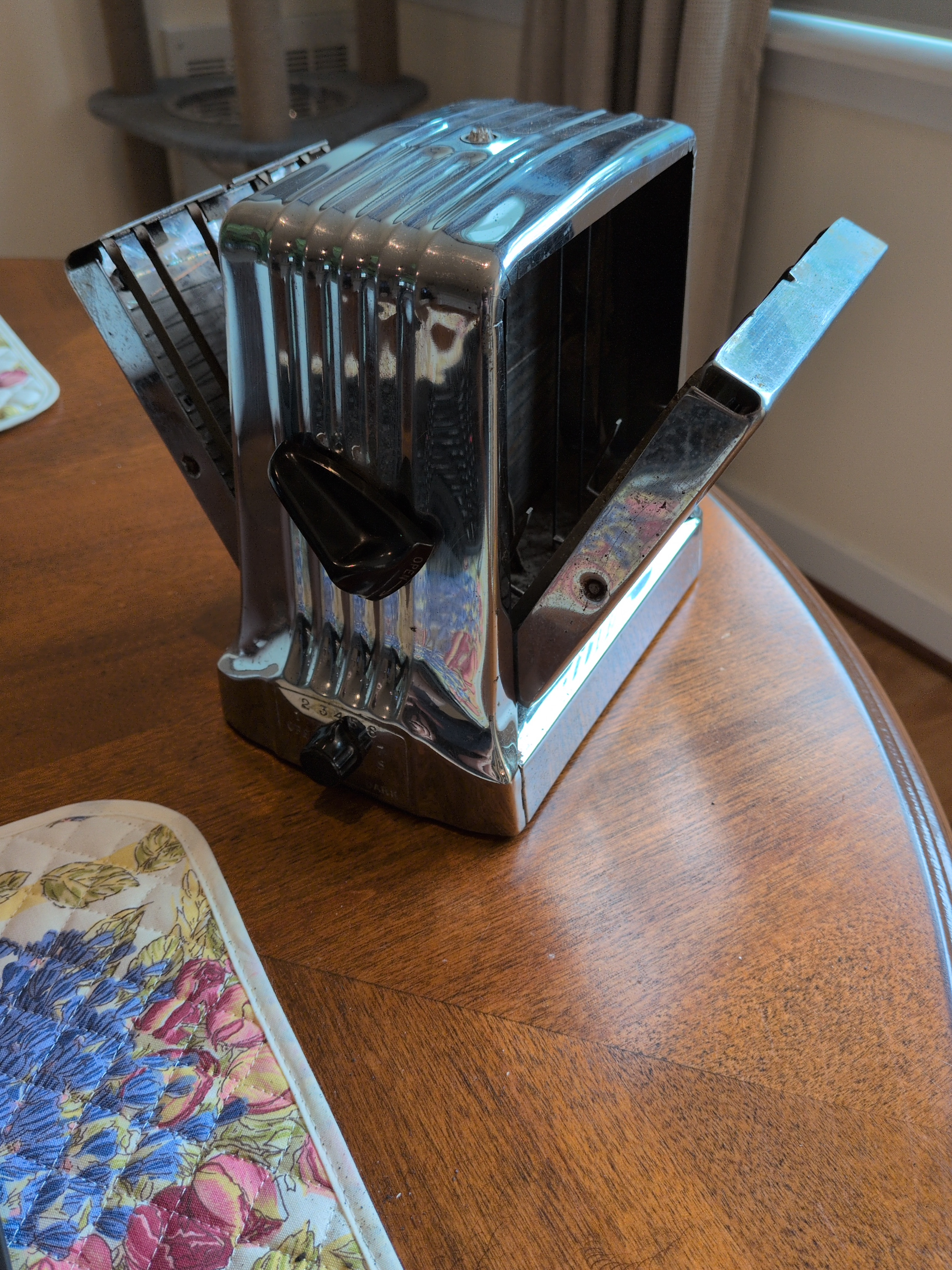 Hotpoint 129T41 This thing is SOLID. It has a bimetalic strip that controls the temperature, similar to later Sunbeam toasters, and has elements both centrally arranged and in the flip-out doors! It weighs roughly 4lbs and has a centrally located “eye” on the top.