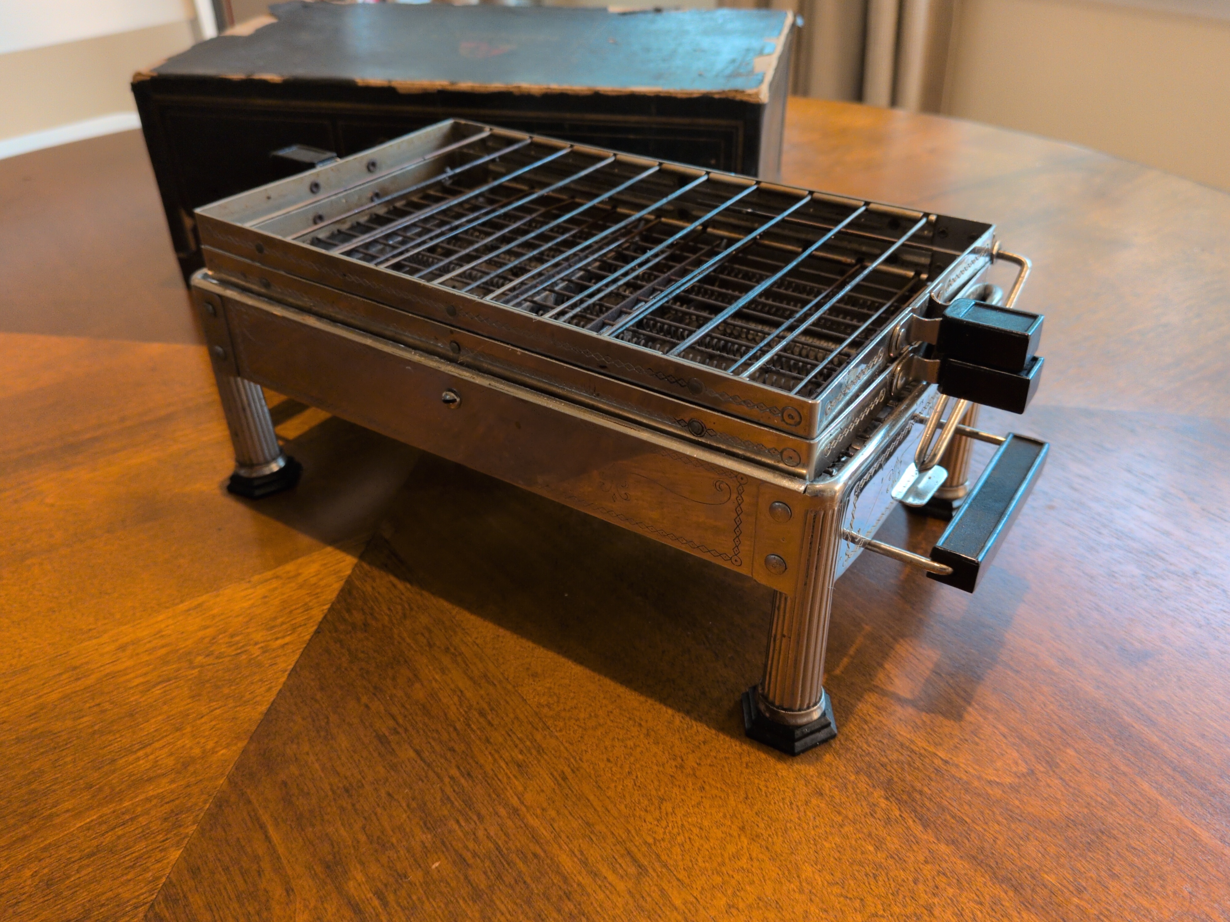 This. This is my favorite toaster of all time from the perspective of function. It’s so good I have 2. It features a cage that flips in a radial manner, making turning the toast easy without burning your fingers. You can also pull the toast away from the element to remove it. It toasts phenominally well, using the rising properties of heat to cook the bread.